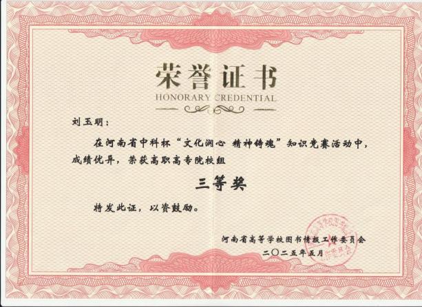 近日,在河南牧業(yè)經(jīng)濟(jì)學(xué)院圖書(shū)館舉辦的河南省中科杯“文化潤(rùn)心、精神鑄魂”知識(shí)競(jìng)賽中,我校選手史全吾老師、劉玉明老師分別榮獲高職高專(zhuān)組二等獎(jiǎng)和三等獎(jiǎng)。